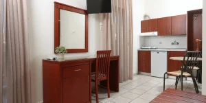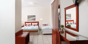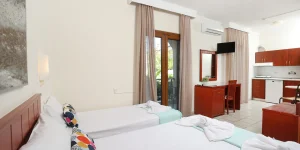Το οικονομικό τρίκλινο διαθέτει μπαλκόνι με θέα στην πίσω αυλή και τη γειτονιά και είναι εξοπλισμένο με πολυτελή υποαλλεργικά, αντιβακτηριακά στρώματα, εξοπλισμένη μικρή κουζίνα, αυτόνομο κλιματισμό, τηλεόραση 32” με δορυφορικά κανάλια, θυρίδα ασφαλείας, δωρεάν WiFi, προϊόντα περιποίησης στο μπάνιο και στεγνωτήρα μαλλιών. Μπορεί να φιλοξενήσει 2 ενήλικες και 1 παιδί (ή εναλλακτικά 1 βρέφος σε παρκοκρέβατο). Το ίδιο δωμάτιο μπορεί να διαμορφωθεί ως δίκλινο με μεγάλο διπλό κρεβάτι ή δύο μονά. Αυτός ο τύπος δωματίου τοποθετείται είτε στον πρώτο είτε στον δεύτερο όροφο. Το μέγεθός του είναι 25 τμ.